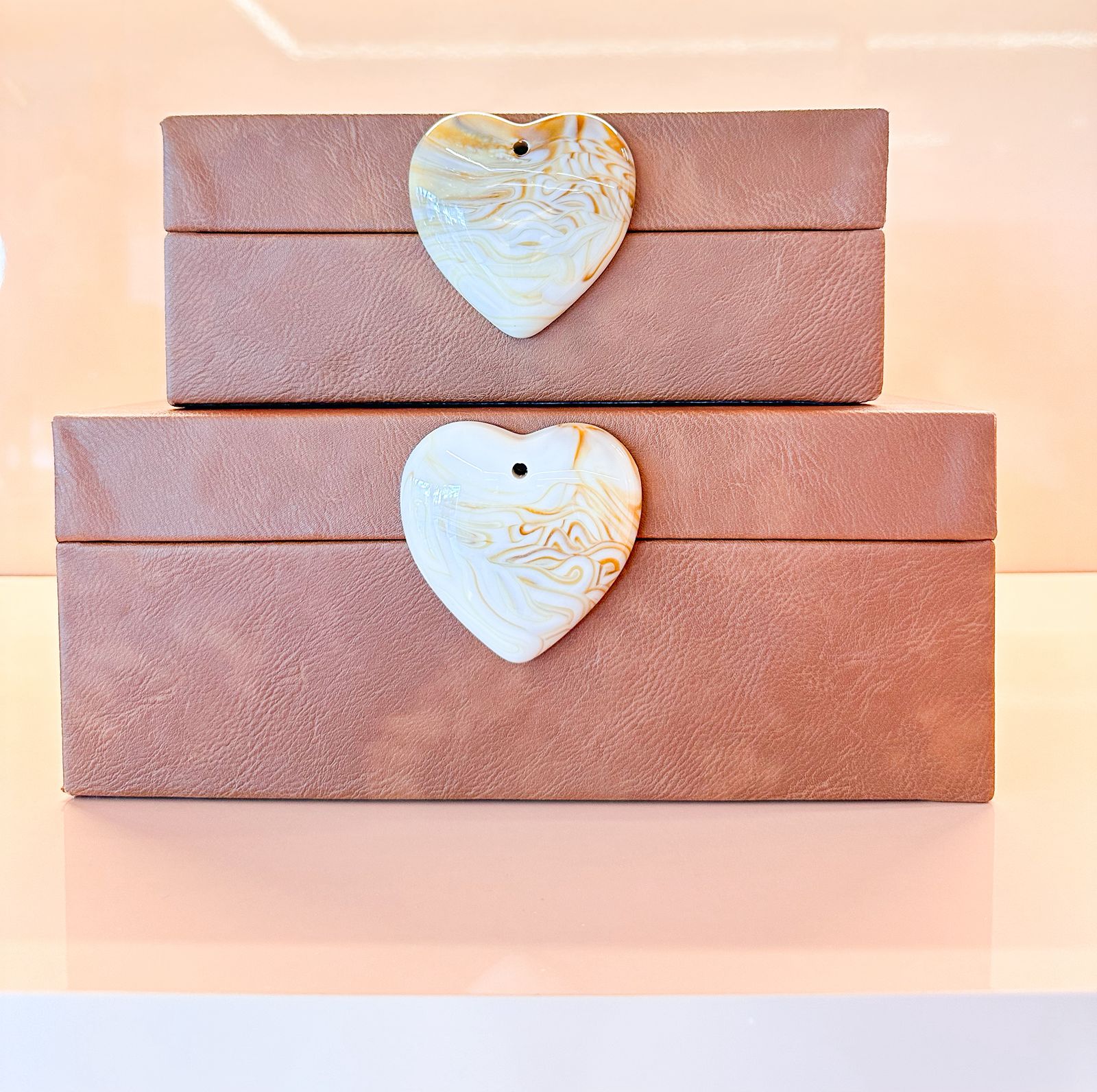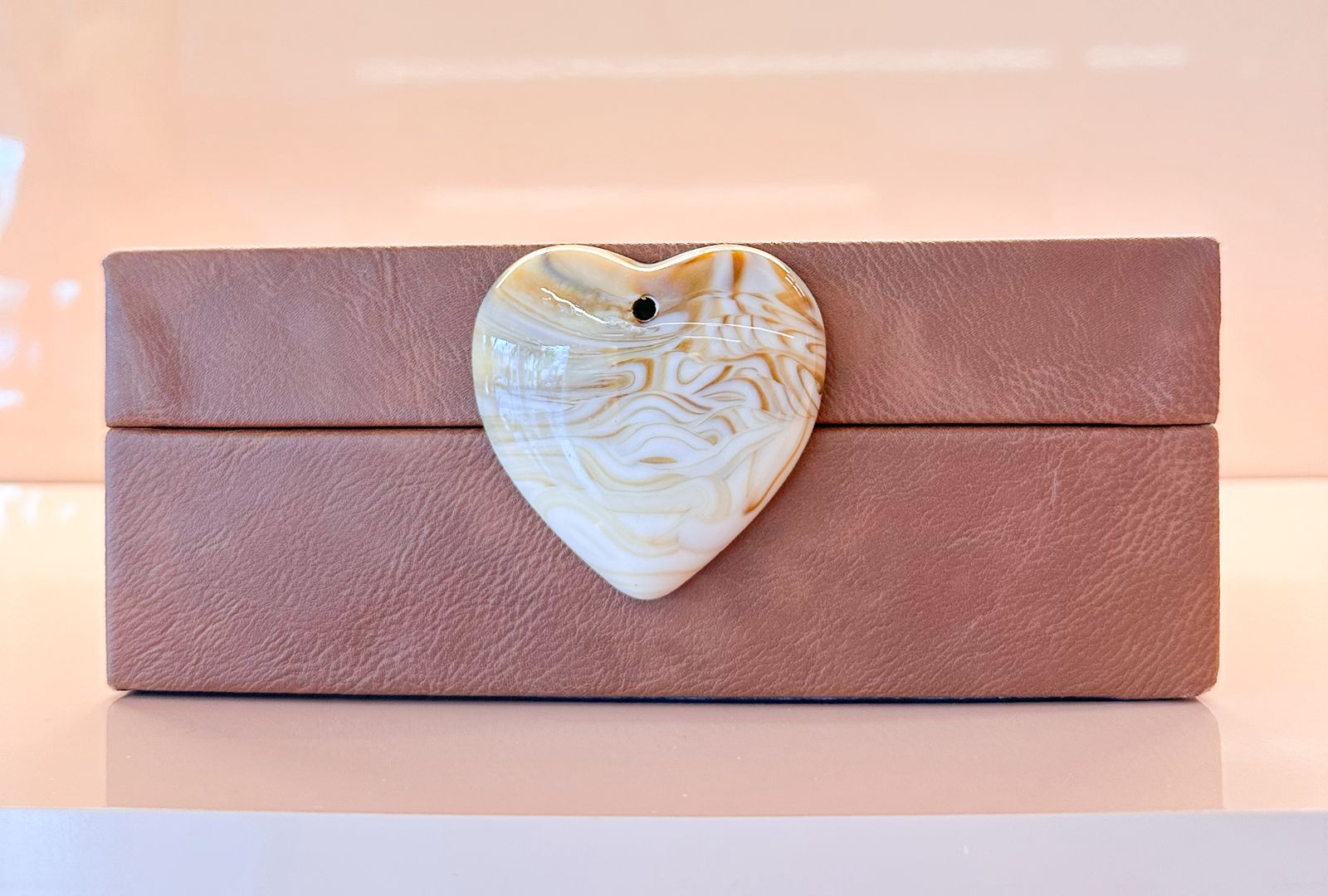 A caixa "Coração Marmorizado" combina funcionalidade e beleza com um visual contemporâneo e afetivo. Revestida em material com textura que remete ao couro, em um tom suave de rosa antigo, ela se destaca pelo delicado detalhe frontal: um coração em cerâmica marmorizada, com veios orgânicos em branco e caramelo, criando um efeito visual único e sofisticado.