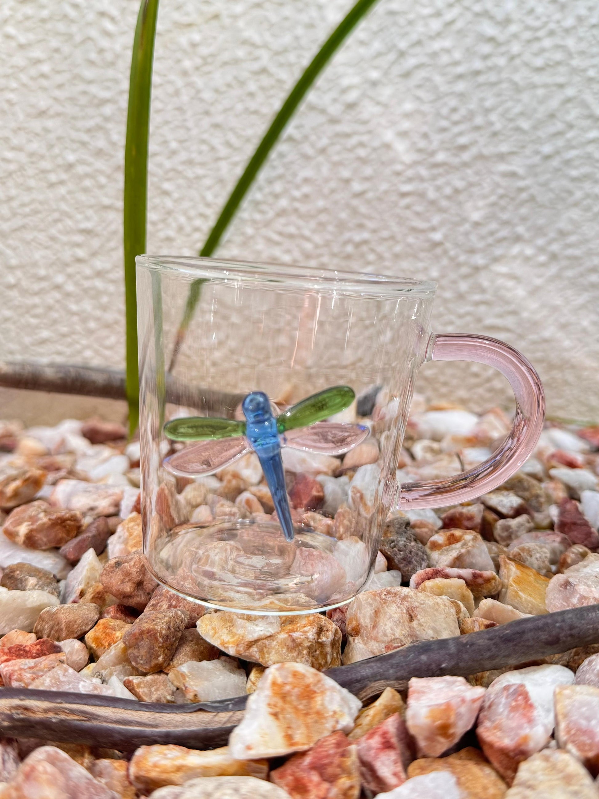 Delicada e encantadora, esta caneca de vidro transparente traz uma libélula artesanal em relevo, esculpida em vidro colorido no interior da peça. Com cabo em tom rosado translúcido, ela une beleza e leveza em um só produto. Ideal para quem aprecia detalhes únicos e um toque de natureza à mesa.