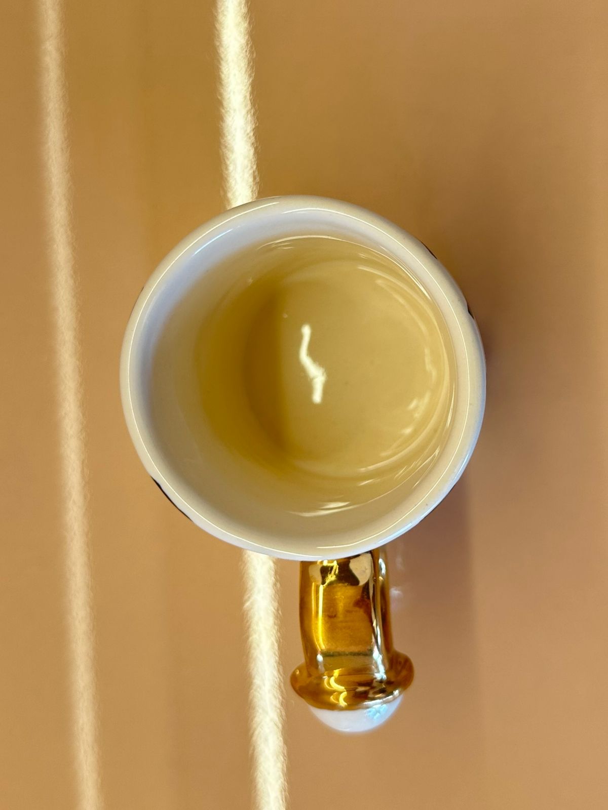 A caneca "Selva Dourada" é uma peça ousada que mistura o estilo selvagem das listras inspiradas em estampas de zebra com a sofisticação de uma alça dourada escultural. Feita em cerâmica esmaltada branca, a pintura preta orgânica e expressiva envolve o corpo da caneca como pinceladas de liberdade e movimento.