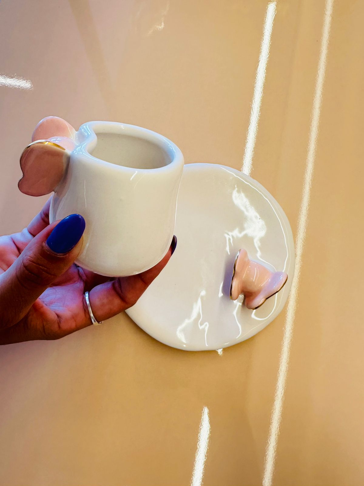 Transforme seu momento à mesa em uma experiência sensorial com o conjunto de cerâmica "Asas Rosé". Composto por uma xícara e pires em porcelana branca de acabamento brilhante, o destaque vai para as alças esculpidas em formato de pequenas asas em tom rosé com bordas douradas, que evocam leveza, fantasia e um toque contemporâneo.