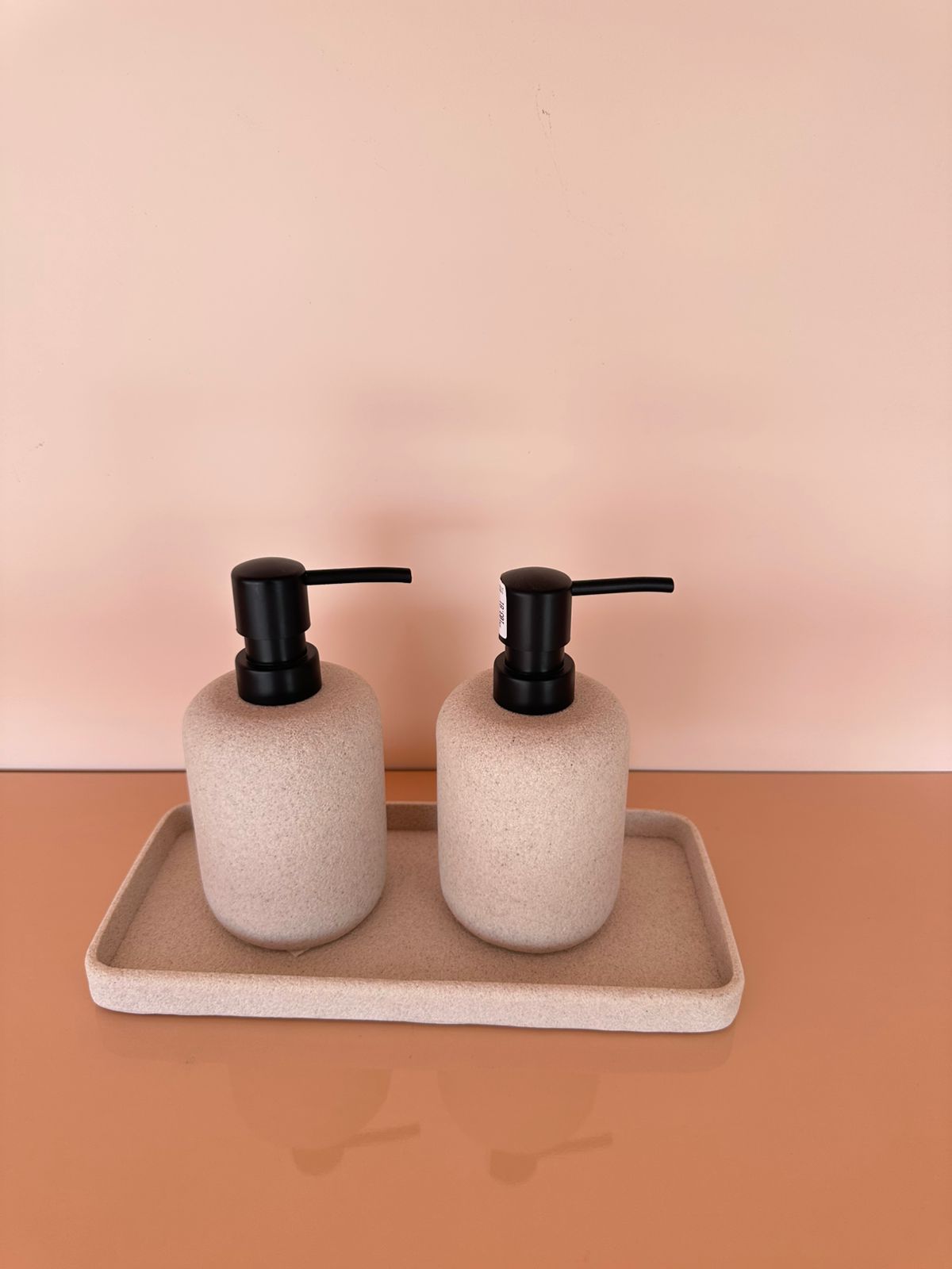 Este conjunto de lavabo traz dois dispensers com acabamento arenoso em tom bege claro e válvulas pretas foscas, apoiados sobre uma bandeja retangular no mesmo material. A estética é limpa e moderna, perfeita para banheiros com decoração minimalista, escandinava ou industrial.