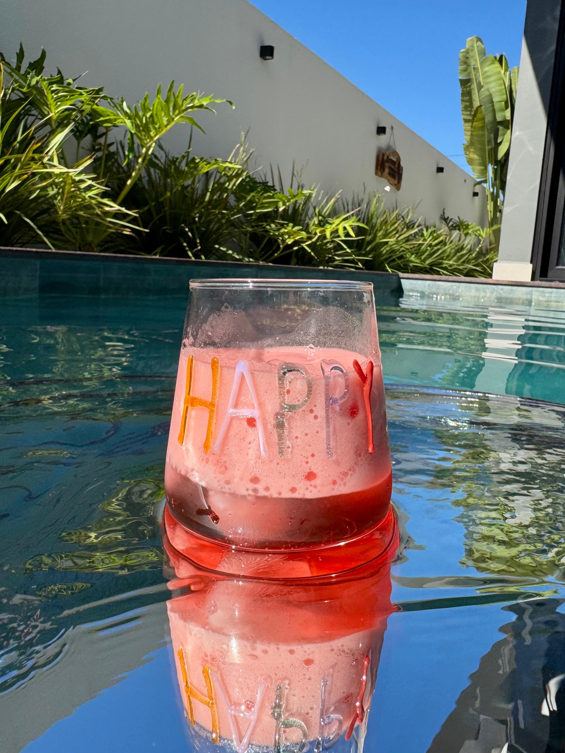 Copo de vidro com design exclusivo e a palavra ‘HAPPY’ em relevo colorido, ideal para drinks, sucos e smoothies. Um item que une estilo, alegria e descontração, perfeito para momentos ao ar livre ou para compor uma mesa criativa e vibrante.