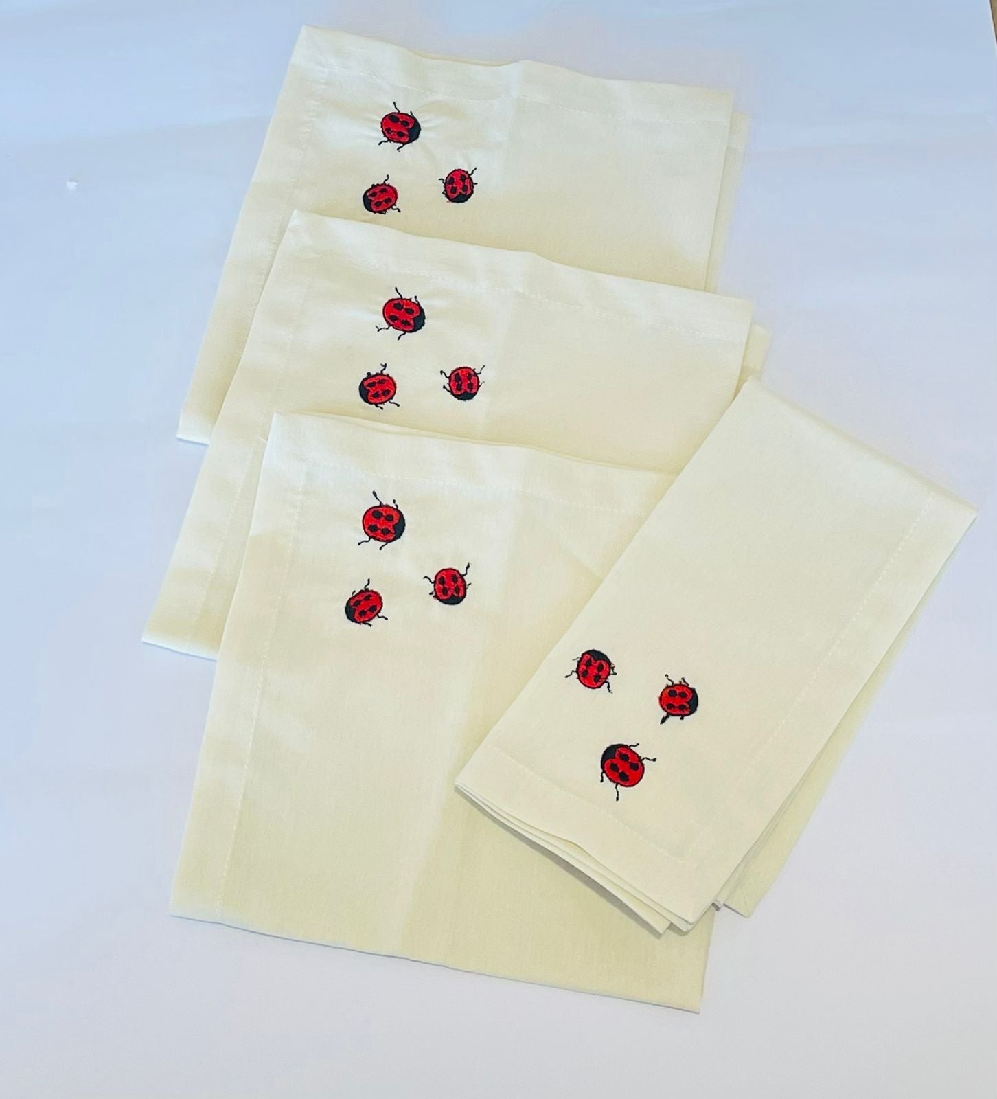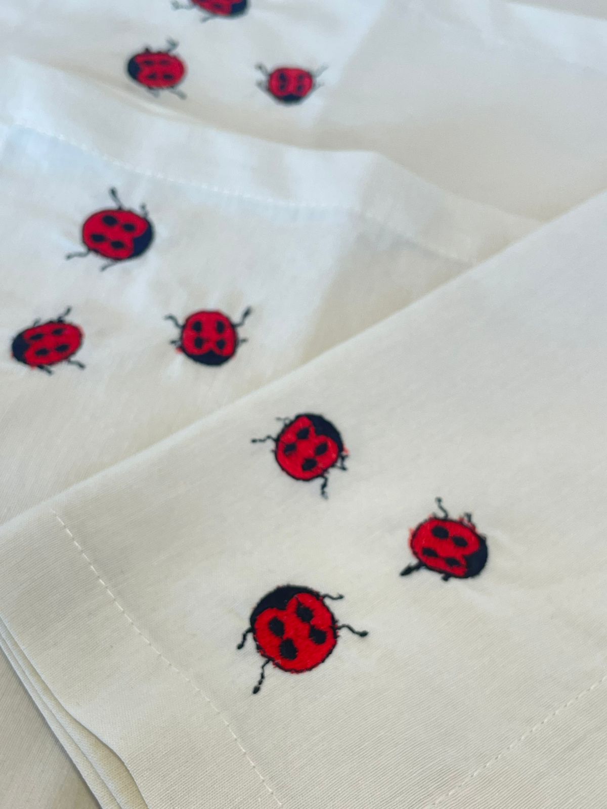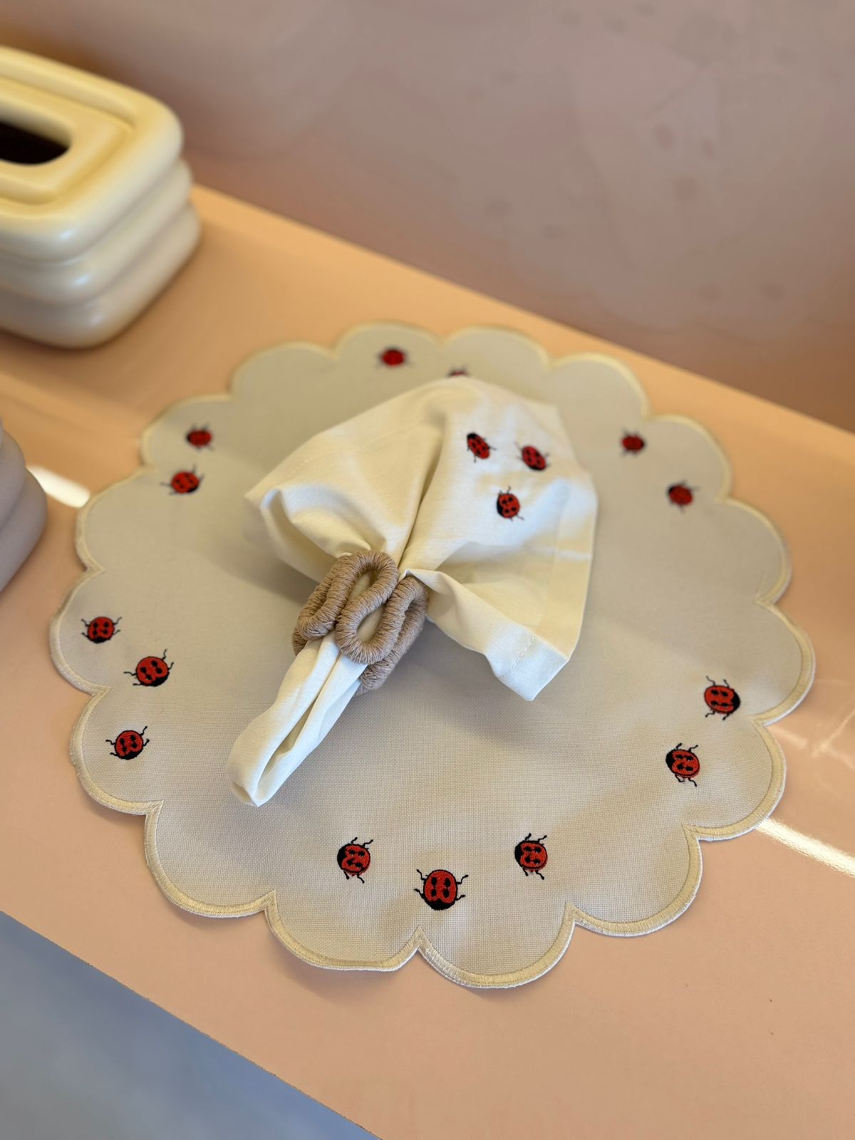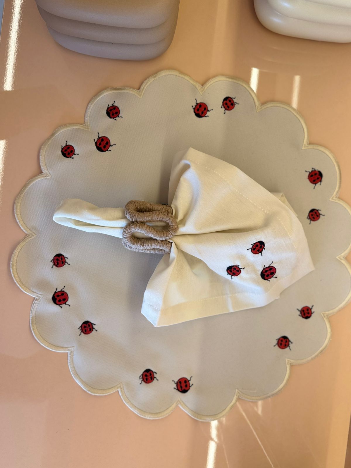 Encante seus convidados com o charme lúdico e delicado do guardanapo bordado com joaninhas. Produzido em tecido de alta qualidade, o guardanapo off-white traz bordados vibrantes de joaninhas espalhadas pela peça, adicionando um toque divertido e ao mesmo tempo sofisticado à mesa posta. Ideal para composições leves, temáticas ou primaveris, é perfeito para almoços ao ar livre, cafés da manhã especiais ou piqueniques elegantes.