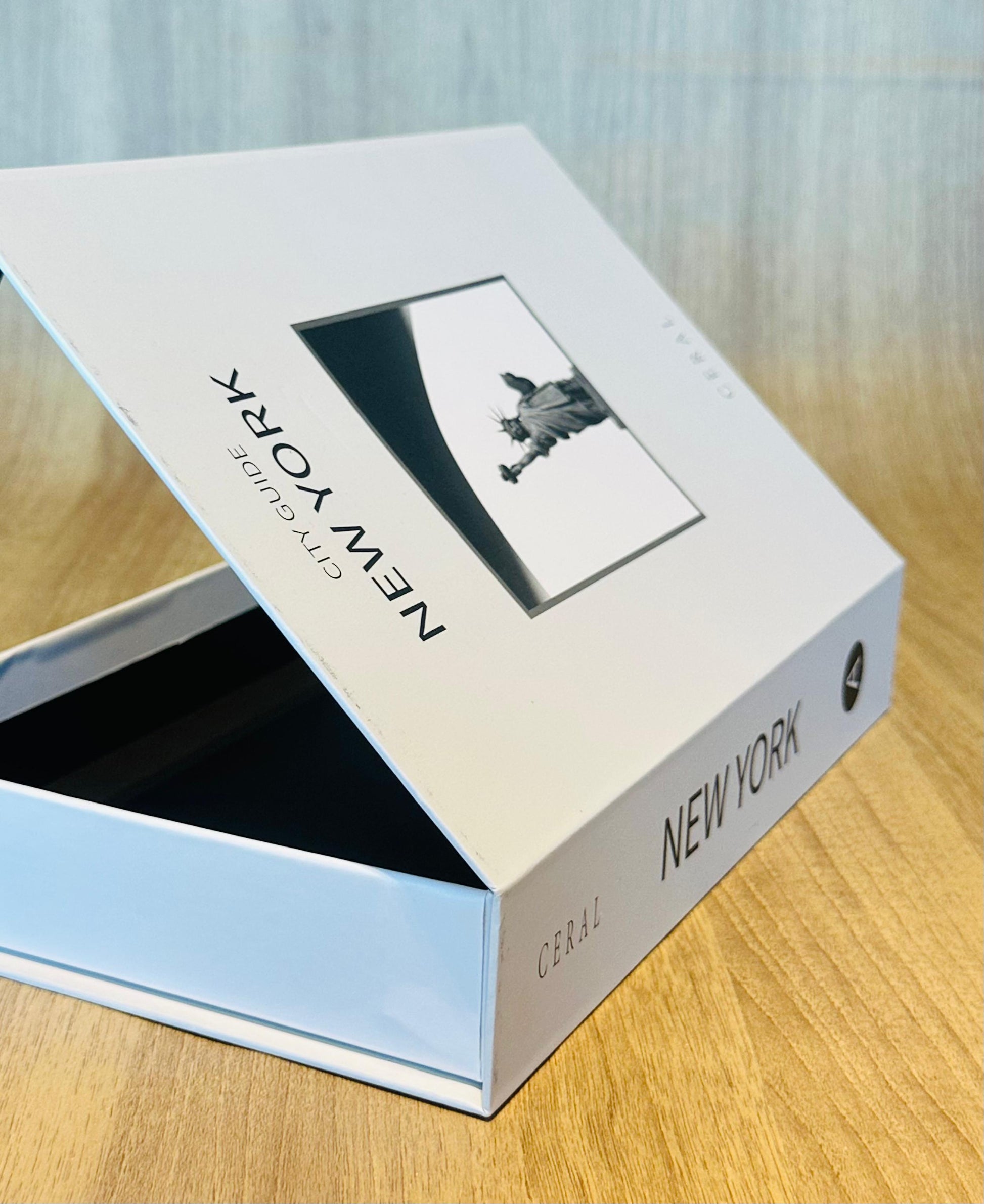 Livro decorativo com capa dura em material resistente, acabamento fosco, e miolo fictício ou com espaço interno para armazenamento.
