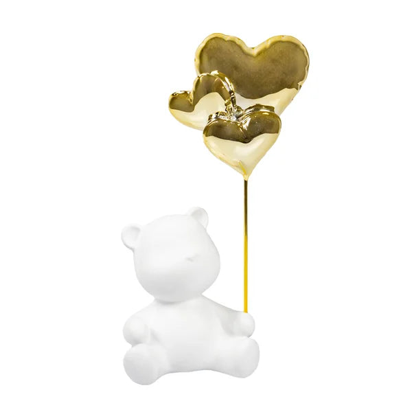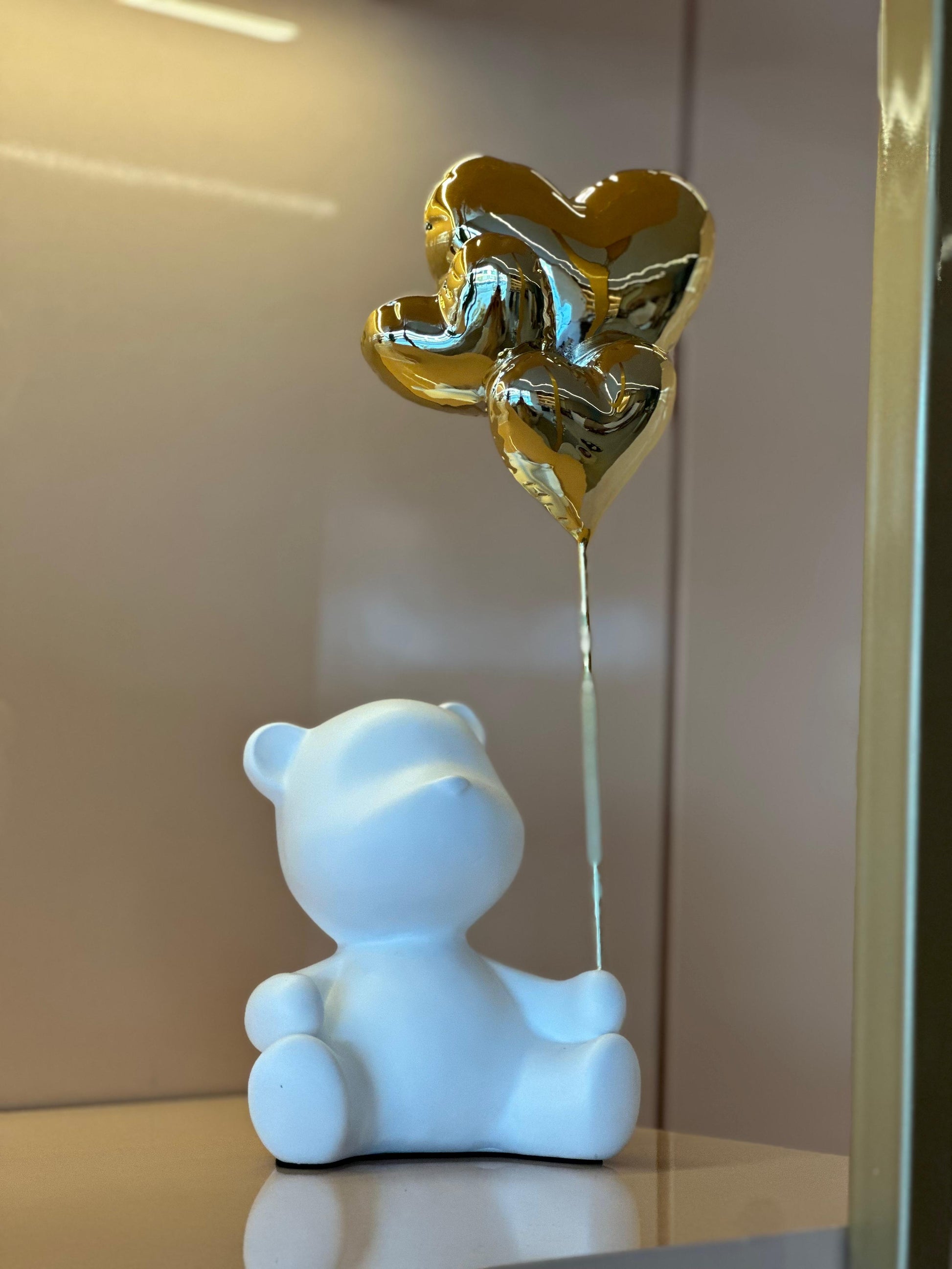 Adicione um toque de encanto e delicadeza ao seu espaço com esta linda escultura em resina de um ursinho segurando balões em formato de coração. Perfeito para decorar ambientes como quartos, salas ou escritórios, este item traz uma atmosfera fofa e romântica, ideal para presentear ou para quem busca um detalhe especial na decoração. A combinação do ursinho com os balões de coração cria uma peça única, cheia de significado e charme.