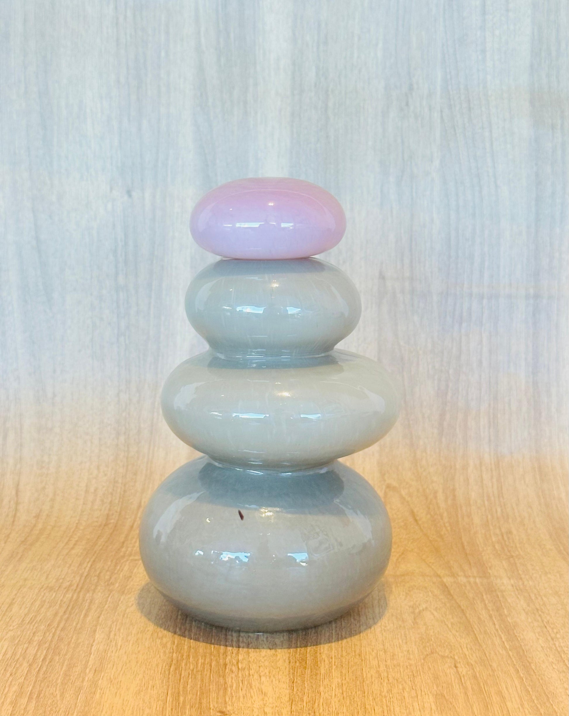 Transforme qualquer ambiente com o charme lúdico e sofisticado do Vaso Candy Stack. Inspirado no design orgânico das pedras empilhadas, este vaso em vidro esmaltado traz uma paleta suave que combina tons de branco leitoso com um delicado topo lilás translúcido, lembrando confeitos e doces elegantes.