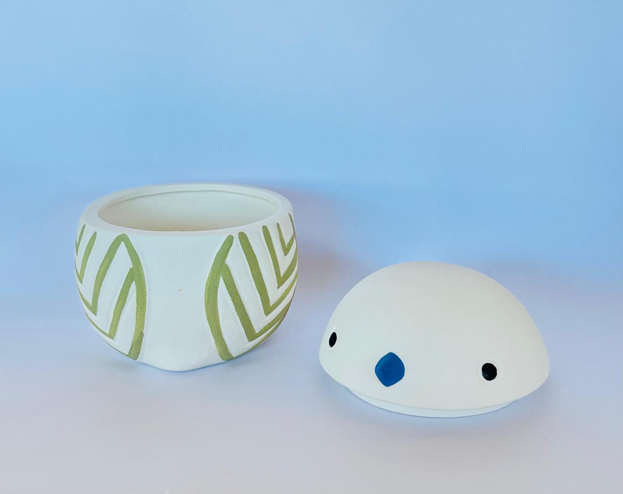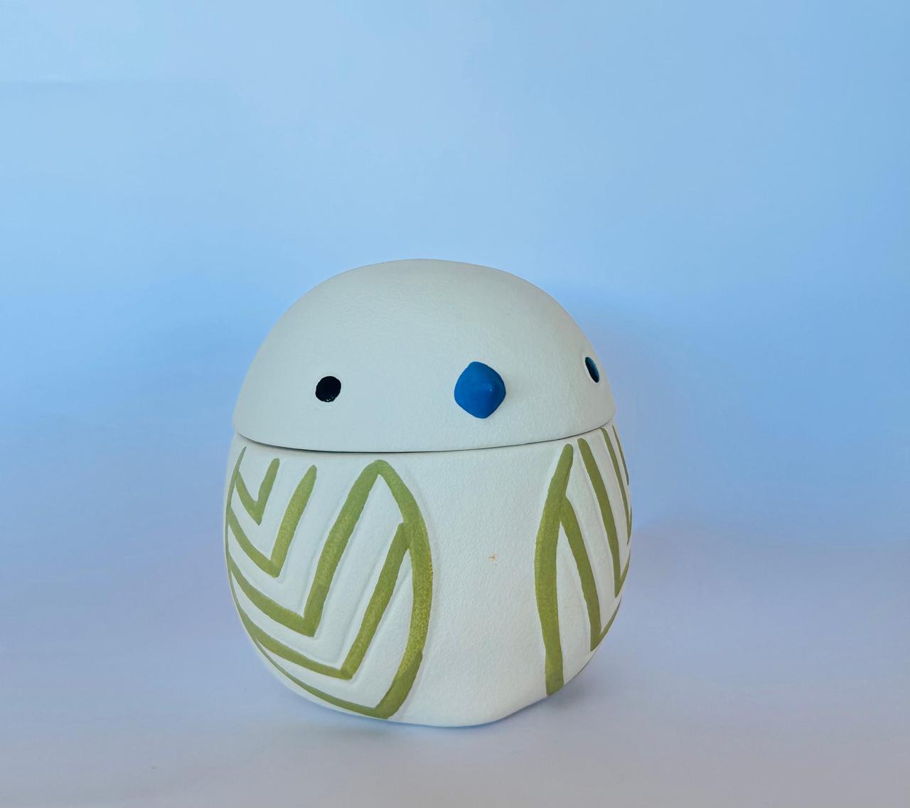 Inspirado na doçura do canto do uirapuru, este vaso com tampa traz o encanto da natureza em uma peça lúdica e funcional. Com formato arredondado e acabamento fosco, o Vaso Uirapuru remete à silhueta de um passarinho sereno, com detalhes pintados à mão em verde e azul que evocam folhas e penas.