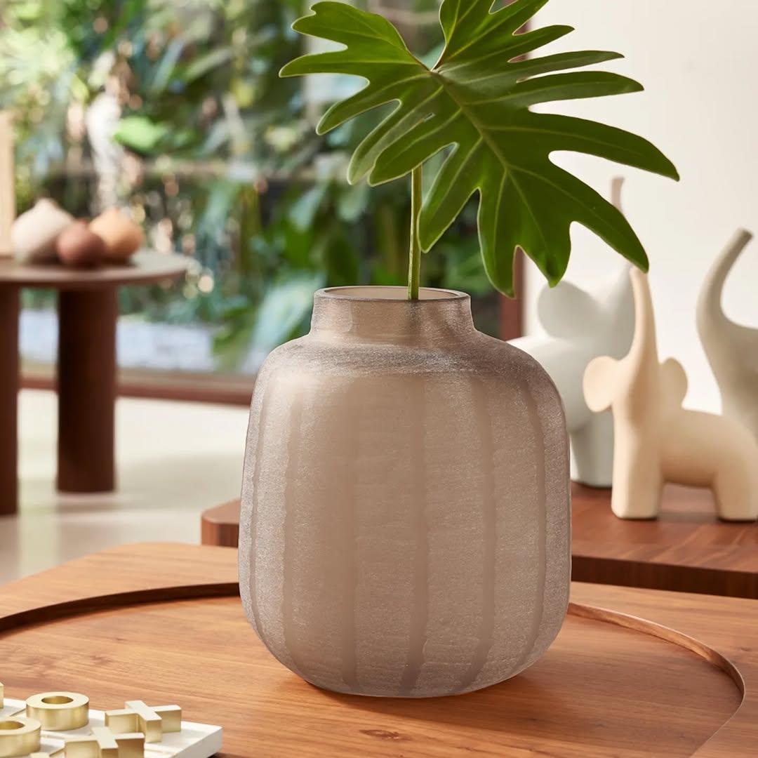 Com linhas suaves e acabamento fosco, este vaso de vidro é a escolha perfeita para composições elegantes e contemporâneas. Sua tonalidade bege translúcida e o efeito texturizado garantem um visual sofisticado e moderno, ideal para ambientes que valorizam a estética natural e minimalista. Perfeito para acomodação de folhas, flores secas ou simplesmente como peça decorativa.