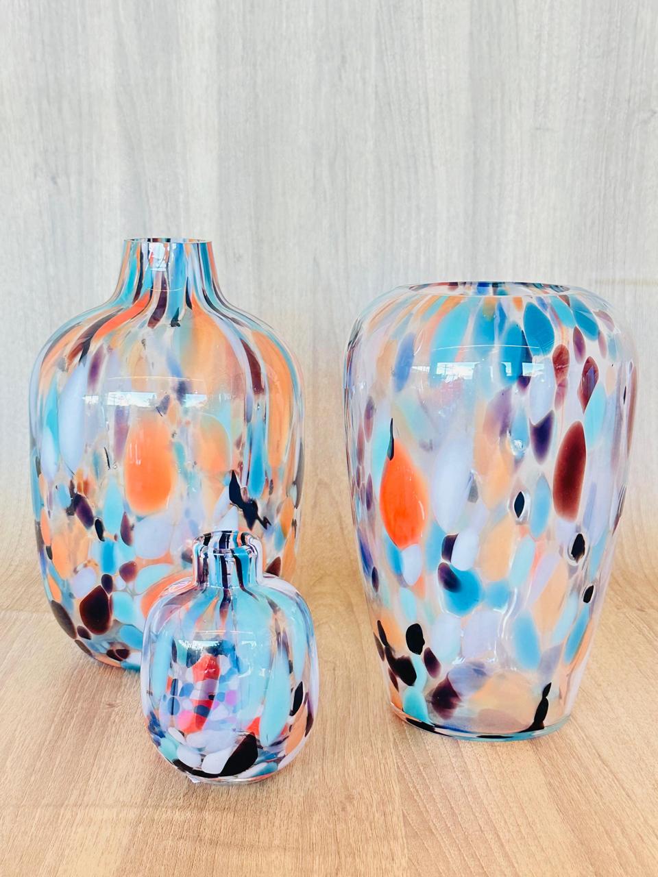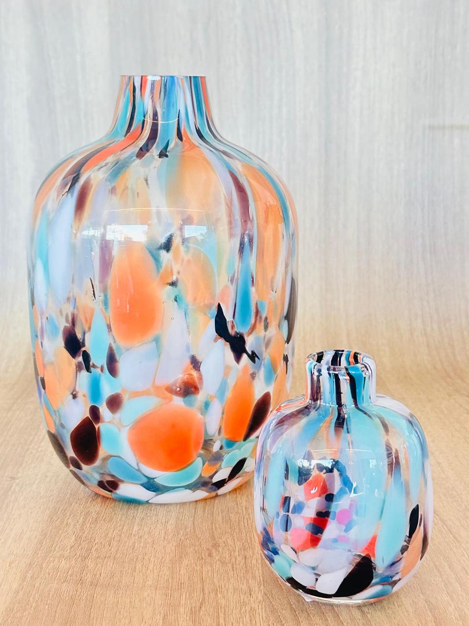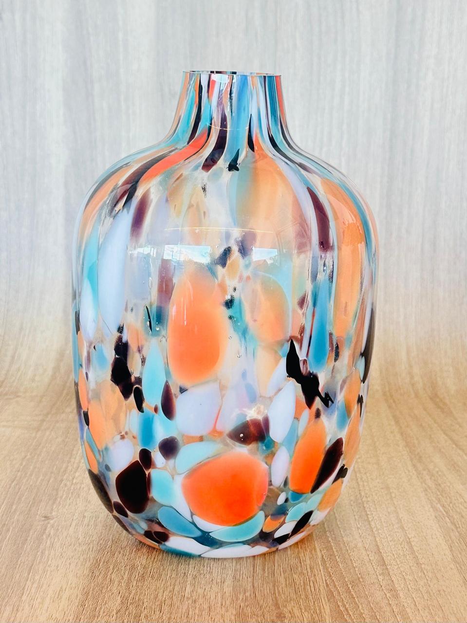 Com cores vibrantes e formas orgânicas que lembram a pelagem selvagem da onça, este vaso é uma verdadeira obra de arte em vidro. O Vaso Onça traz um mix marcante de tons alaranjados, pretos, azuis e brancos, criando uma estética ousada, autêntica e cheia de personalidade.