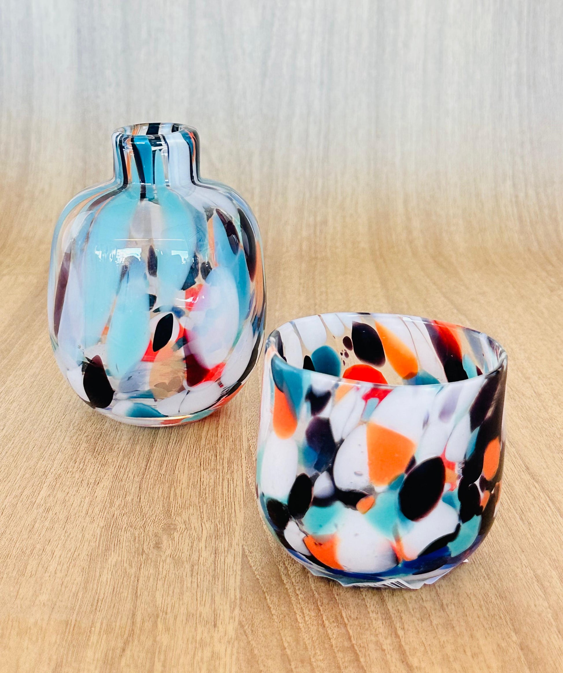 Pequeno no tamanho, gigante no charme. O Vaso Onça PP é a escolha ideal para quem deseja adicionar um toque artístico e colorido a cantinhos especiais da casa. Feito em vidro soprado com manchas vibrantes que lembram o padrão de uma onça estilizada, ele combina tons de azul, laranja, branco, preto e lilás em uma composição única e cheia de personalidade.