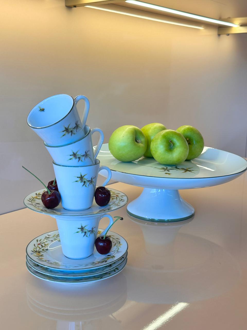 Xícara branca com estampa localizada de flor na parte externa e abelha na parte interna, filete verde na borda. Filete verde e decalque de flores toda borda do pires.